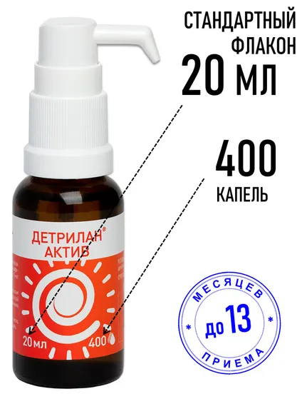 В стандартном флаконе 20 мл содержится 400 капель по 1000 МЕ ДЕТРИЛАНА АКТИВ. Общее количество витамина D3 во флаконе - 400 000 МЕ, столько же, как и в 50 мл флаконе обычного классического ДЕТРИЛАНА.