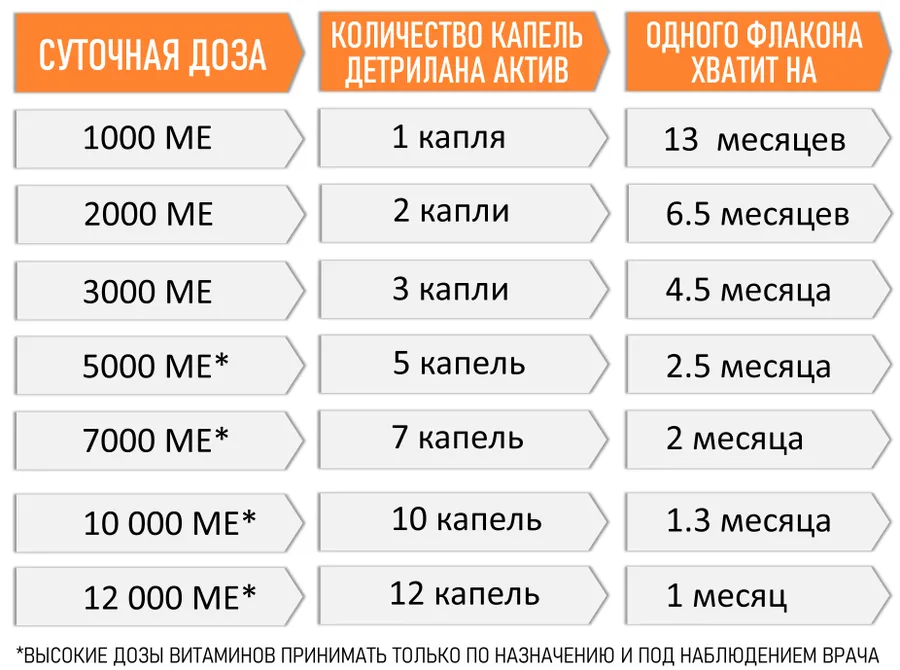 - ДЕТРИЛАН АКТИВ рекомендуется тем, у кого выявлен дефицит или выраженная недостаточность витамина D и кто принимает витамин D3 курсом от 3 до 6 месяцев в дозировке от 3000 МЕ (3 капли) в день и больше.