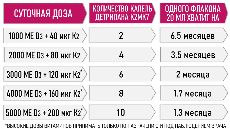 - При необходимости ДЕТРИЛАН К2МК7 может назначаться врачом курсами по 3 - 6 месяцев в более высокой дозировке 4000 - 8000 МЕ (8 - 16 капель) и выше с последующим снижением дозы и возвратом к профилактическому приему.