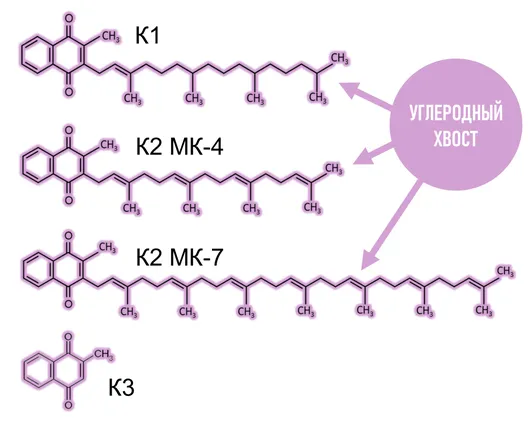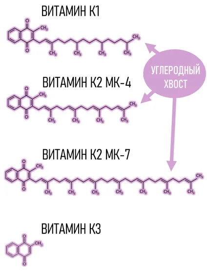 Все витамины К схожи по структуре, но витамин К2 МК-7 отличается большей длиной и степенью насыщенности углеродного "хвоста". Благодаря длинному "хвосту" К2 МК-7 циркулирует в крови и действует более длительно и значительно превосходит другие витамины К по влиянию на метаболизм.
