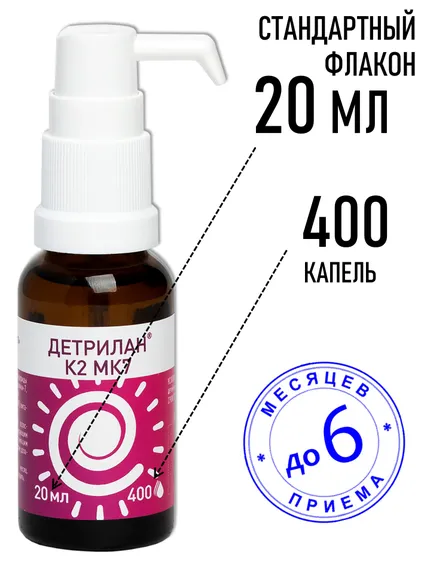 В стандартном флаконе 20 мл содержится 400 капель ДЕТРИЛАНА К2МК7. В зависимости от принимаемой дозы одного флакона хватит на 1 - 6 месяцев приема одному человеку. Относительно невысокая стоимость флакона делает прием ДЕТРИЛАНА К2МК7 достаточно экономичным и рациональным даже при приеме больших доз витамина D3.