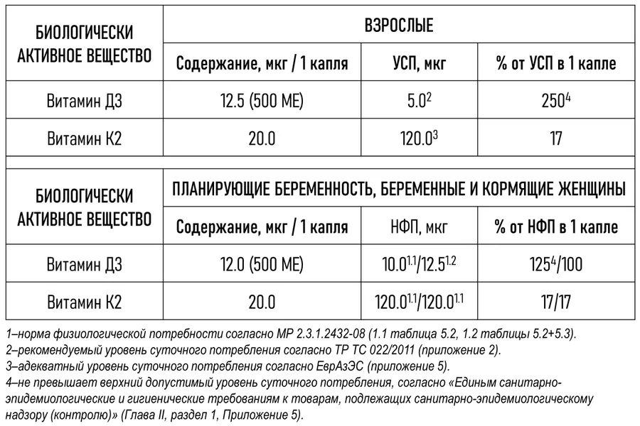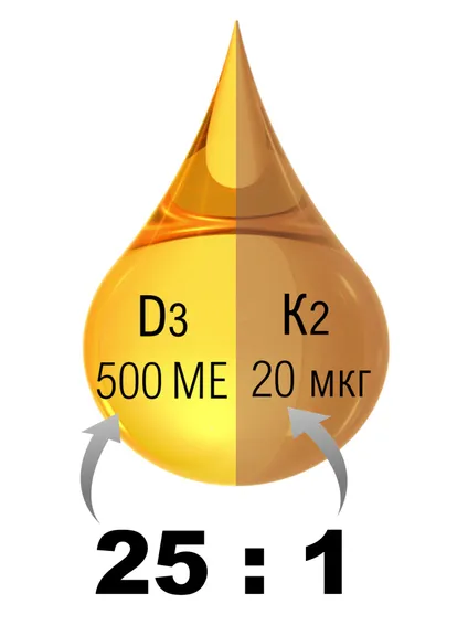 1 капля (0,05 мл) содержит 12,5 мкг (500 МЕ) витамина Д3 и 20 мкг витамина К2.