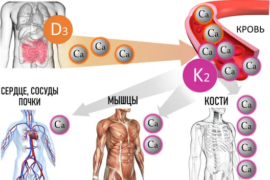 Известно, что витамин D увеличивает всасывание кальция в кишечнике и за счет этого повышает его уровень в крови. Если витамина К недостаточно, то кальций из крови в больших количествах бесконтрольно поступает в клетки всех органов. Особо чувствительны к избытку кальция оказались артериальные сосуды, сердце и почки. В них в первую очередь образуются кальцинаты, которые провоцируют сердечную недостаточность, ригидность (потерю эластичности) и атеросклероз сосудов, почечную недостаточность. Кроме того, избыточный кальций откладывается в больших количествах в атеросклеротических бляшках, провоцирую и усугубляя развитие атеросклероза артерий сердца, головного мозга, верхних и нижних конечностей, почек.