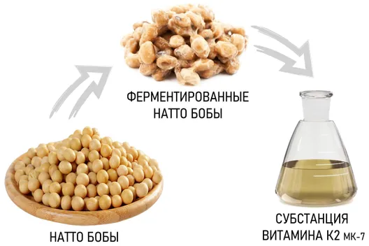 Натуральный витамин К2 производится путем естественной ферментации натто-бобов. Ферментация - это достаточно дорогой и длительный процесс, но получаемый витамин К2 МК-7 (состоящий в основном из активных транс-изомеров) полностью идентичен натуральному и абсолютно безопасен для организма.