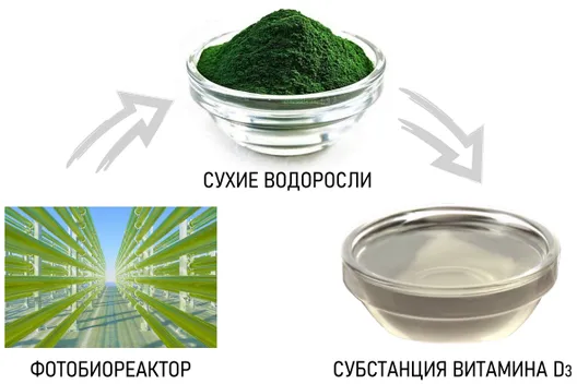 В производстве ДЕТРИЛАНА ВЕГА используется субстанция витамина D3 из микроводорослей Nannochloropsis oceanica и Nannochloropsis limnetica. В промышленных масштабах микроводоросли выращивают и облучают ультрафиолетом в специальных фотобиореакторах. Микроводоросли Nannochloropsis синтезируют производное холестерина - 7-дегидрохолестерин, который под воздействием ультрафиолета превращается в витамин D3. Процесс похож на синтез витамина D3 в коже человека. Содержание витамина D3 в этом растительном сырье не очень высокое, а трудоемкость и стоимость производства субстанции витамина D3 значительно выше, чем из ланолина. Зато этот витамин подходит веганам и строгим вегетарианцам.